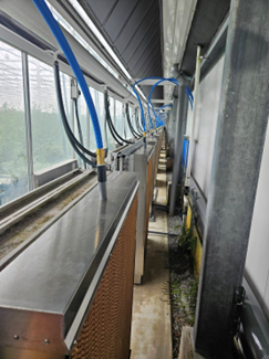 昨今の猛暑の影響で既存空調設備では冷却能力がたりなくなっており、毎月のランニングコストも非常に大きくなっていた。既設空調の前段にアクアハイブリッドパネルを取り付け予冷をすることで月に数百万円のコスト削減を実現、ハウス内の冷却もじゅうぶんに行えるようになりました。